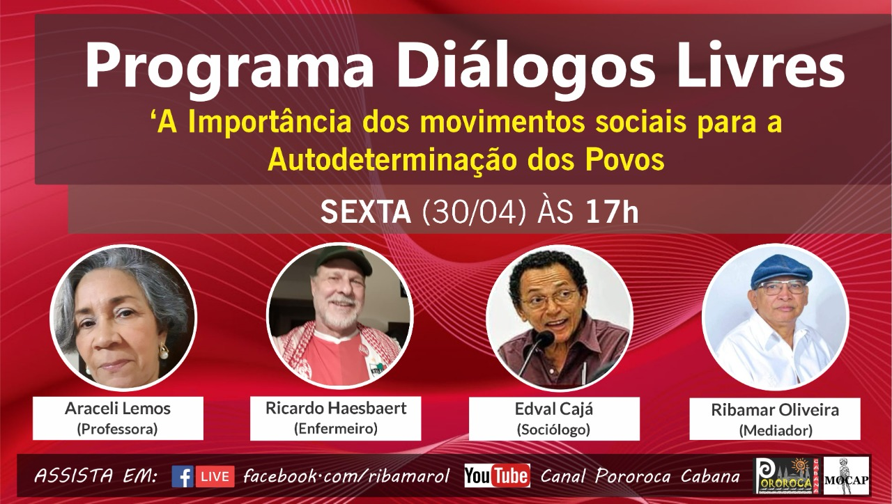 Vamos conversar com a Profa. e ex Deputada Estadual Araceli Lemos, Enfermeiro e assessor parlamentar Ricardo Haesbaert, Sociólogo e ex preso político Edval Nunes Cajá sobre o tema A Importância dos Movimentos Sociais para a Autodeterminação dos Povos Com parcerias do Movimento Cabano de apoio a autodeterminação dos povos - MOCAP e Pororoca Cabana.